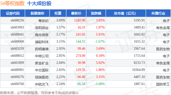 证券之星消息,10月15日,50等权(000050)指数报收于2408.3点,涨1.19%,成交1571.06亿元,换手率0.37%。当日该指数成份股中,上涨的有33家,海光信息以5.91%的涨幅领涨,下跌的有16家,中航沈飞以1.68%的跌幅领跌。