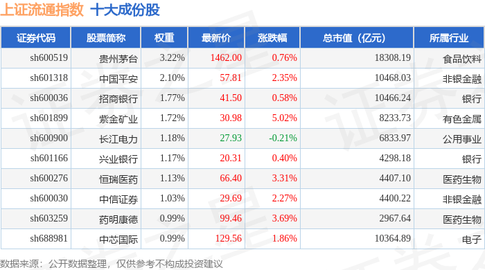证券之星消息,10月15日,上证流通(000090)指数报收于1439.73点,涨1.33%,成交9526.74亿元,换手率1.36%。当日该指数成份股中,上涨的有1710家,金盘科技以20.0%的涨幅领涨,下跌的有416家,广大特材以9.95%的跌幅领跌。