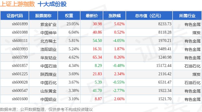 上证上游(000094)指数十大成份股详情如下: