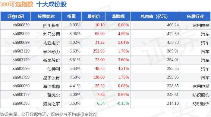 证券之星消息,10月15日,380可选(000107)指数报收于5867.06点,涨2.14%,成交138.15亿元,换手率1.51%。当日该指数成份股中,上涨的有32家,科博达以5.21%的涨幅领涨,下跌的有2家,老凤祥以0.6%的跌幅领跌。