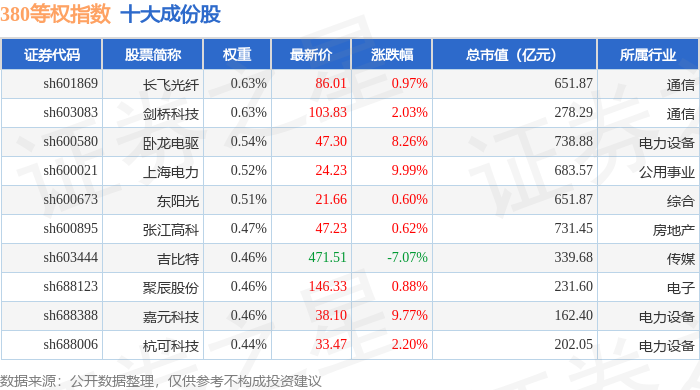 证券之星消息,10月15日,380等权(000115)指数报收于8711.94点,涨1.28%,成交2089.9亿元,换手率1.9%。当日该指数成份股中,上涨的有286家,金盘科技以20.0%的涨幅领涨,下跌的有79家,至纯科技以8.48%的跌幅领跌。