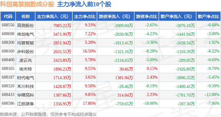 资金流向方面,科创高装(000687)指数成份股当日主力资金净流出合计3.28亿元,游资资金净流入合计1.73亿元,散户资金净流入合计1.55亿元。成份股资金流向详情见下表: