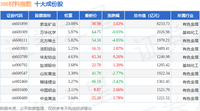 证券之星消息,10月15日,300材料(000909)指数报收于3707.04点,涨1.18%,成交911.43亿元,换手率3.12%。当日该指数成份股中,上涨的有24家,紫金矿业以5.02%的涨幅领涨,下跌的有7家,包钢股份以4.81%的跌幅领跌。