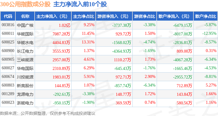 资金流向方面,300公用(000917)指数成份股当日主力资金净流入合计7033.23万元,游资资金净流入合计6238.15万元,散户资金净流出合计1.33亿元。成份股资金流向详情见下表: