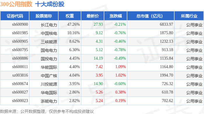 300公用(000917)指数十大成份股详情如下: