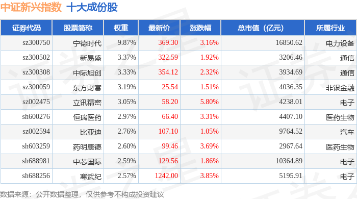 证券之星消息,10月15日,中证新兴(000964)指数报收于11002.23点,涨2.16%,成交3449.44亿元,换手率1.73%。当日该指数成份股中,上涨的有83家,生益科技以10.0%的涨幅领涨,下跌的有16家,北方稀土以4.05%的跌幅领跌。