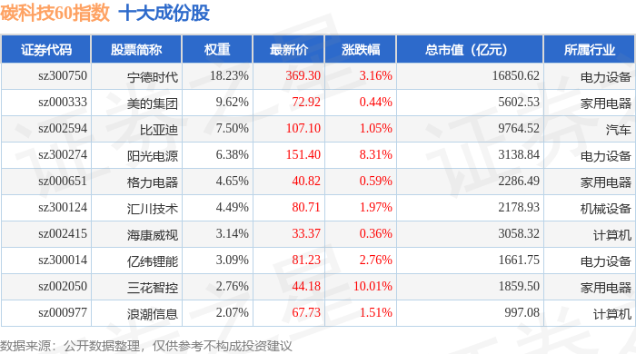 证券之星消息,10月15日,碳科技60(399060)指数报收于3356.02点,涨2.16%,成交1471.39亿元,换手率2.32%。当日该指数成份股中,上涨的有52家,三花智控以10.01%的涨幅领涨,下跌的有8家,锦浪科技以7.57%的跌幅领跌。