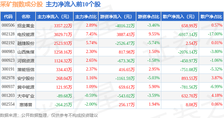 资金流向方面,采矿指数(399232)成份股当日主力资金净流出合计5.88亿元,游资资金净流入合计1439.97万元,散户资金净流入合计5.74亿元。成份股资金流向详情见下表: