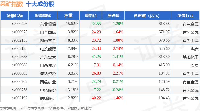 证券之星消息,10月15日,采矿指数(399232)报收于3800.68点,涨0.83%,成交170.19亿元,换手率3.2%。当日该指数成份股中,上涨的有17家,招金黄金以10.02%的涨幅领涨,下跌的有10家,通源石油以1.71%的跌幅领跌。
