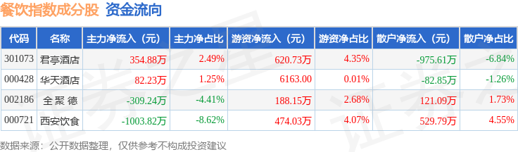 资金流向方面,餐饮指数(399238)成份股当日主力资金净流出合计875.95万元,游资资金净流入合计1283.53万元,散户资金净流出合计407.58万元。成份股资金流向详情见下表: