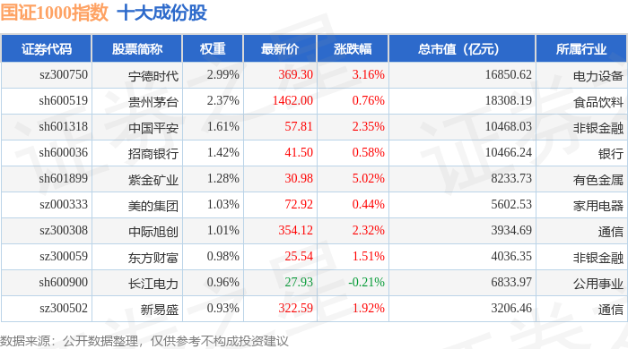 证券之星消息,10月15日,国证1000(399311)指数报收于4907.34点,涨1.46%,成交11303.95亿元,换手率1.21%。当日该指数成份股中,上涨的有739家,金盘科技以20.0%的涨幅领涨,下跌的有226家,锦浪科技以7.57%的跌幅领跌。