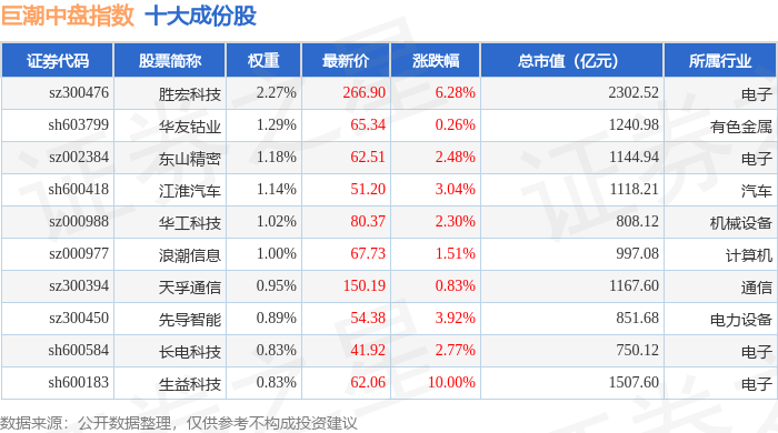 证券之星消息,10月15日,巨潮中盘(399315)指数报收于4664.73点,涨1.33%,成交2998.05亿元,换手率1.71%。当日该指数成份股中,上涨的有228家,生益科技以10.0%的涨幅领涨,下跌的有60家,西部超导以4.36%的跌幅领跌。