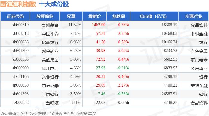 证券之星消息,10月15日,国证红利(399321)指数报收于7638.96点,涨1.01%,成交920.82亿元,换手率0.35%。当日该指数成份股中,上涨的有31家,紫金矿业以5.02%的涨幅领涨,下跌的有17家,中远海控以0.87%的跌幅领跌。