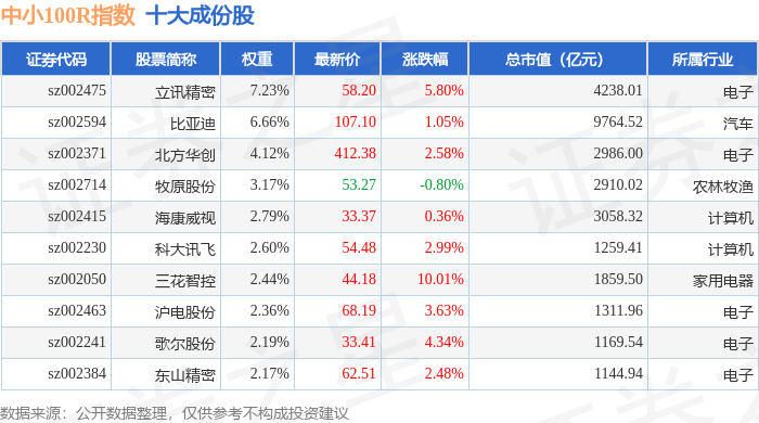 证券之星消息,10月15日,中小100R(399333)指数报收于9869.43点,涨1.77%,成交1458.15亿元,换手率1.84%。当日该指数成份股中,上涨的有82家,三花智控以10.01%的涨幅领涨,下跌的有16家,联泓新科以3.73%的跌幅领跌。