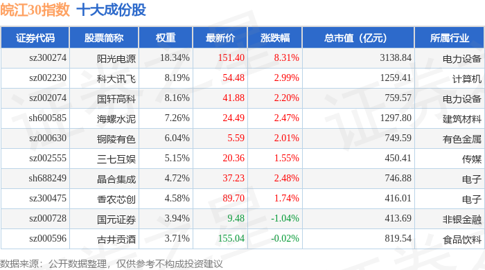 证券之星消息,10月15日,皖江30(399350)指数报收于2881.76点,涨2.71%,成交416.25亿元,换手率3.3%。当日该指数成份股中,上涨的有23家,阳光电源以8.31%的涨幅领涨,下跌的有7家,合肥城建以3.59%的跌幅领跌。