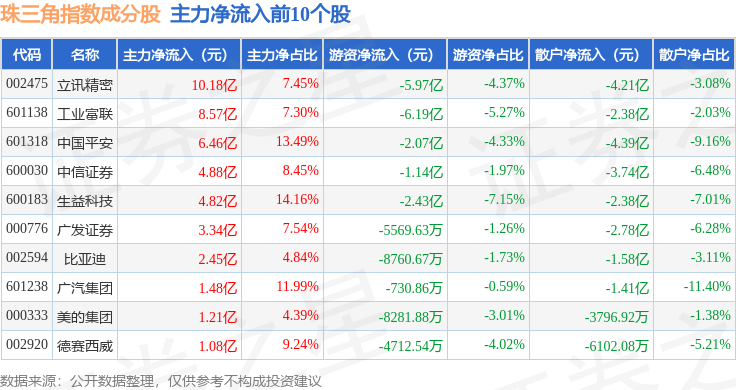 资金流向方面,珠三角(399356)指数成份股当日主力资金净流入合计39.27亿元,游资资金净流出合计22.45亿元,散户资金净流出合计16.82亿元。成份股资金流向详情见下表: