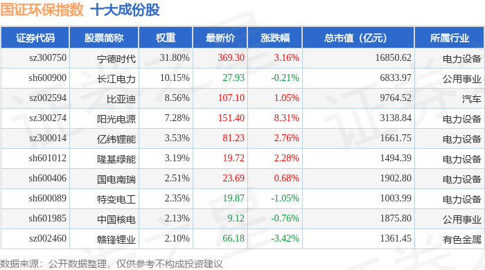 证券之星消息,10月15日,国证环保(399358)指数报收于5519.12点,涨1.91%,成交1091.82亿元,换手率1.63%。当日该指数成份股中,上涨的有27家,阳光电源以8.31%的涨幅领涨,下跌的有12家,赣锋锂业以3.42%的跌幅领跌。