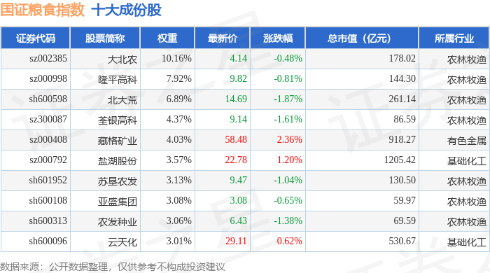 国证粮食(399365)指数十大成份股详情如下: