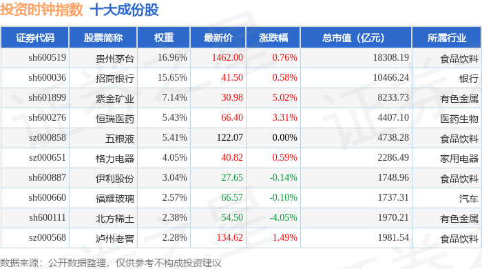 证券之星消息,10月15日,投资时钟(399391)指数报收于3403.14点,涨0.99%,成交1164.45亿元,换手率1.12%。当日该指数成份股中,上涨的有71家,中国高科以5.2%的涨幅领涨,下跌的有23家,北方稀土以4.05%的跌幅领跌。
