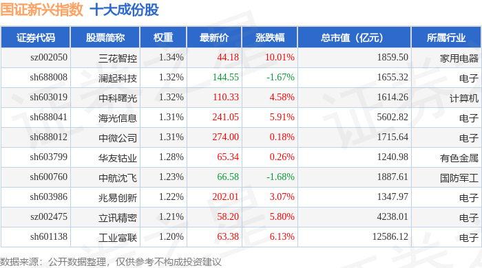 国证新兴(399392)指数十大成份股详情如下: