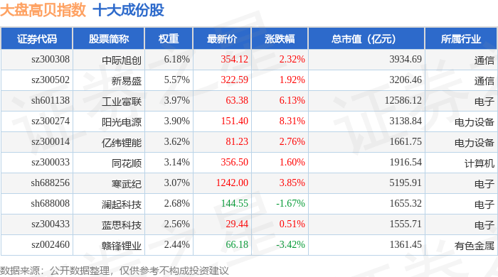 大盘高贝(399405)指数十大成份股详情如下: