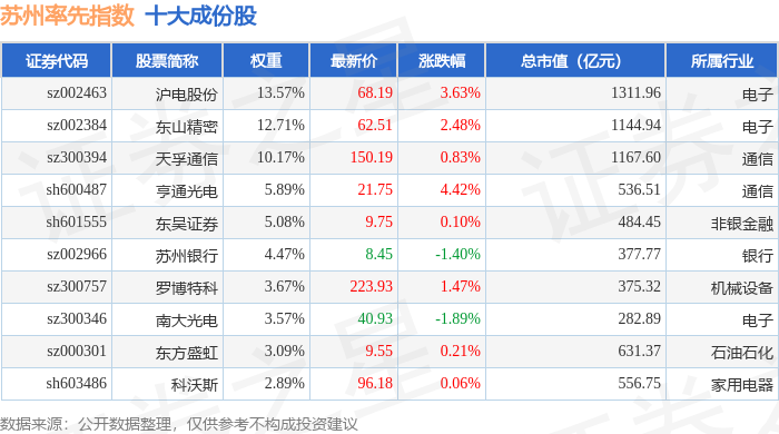 证券之星消息,10月15日,苏州率先(399410)指数报收于2575.63点,涨1.75%,成交255.26亿元,换手率2.03%。当日该指数成份股中,上涨的有25家,阿特斯以5.74%的涨幅领涨,下跌的有5家,南大光电以1.89%的跌幅领跌。