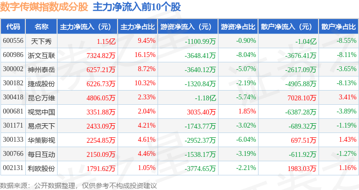 资金流向方面,数字传媒(399434)指数成份股当日主力资金净流出合计2.54亿元,游资资金净流出合计2.5亿元,散户资金净流入合计5.04亿元。成份股资金流向详情见下表: