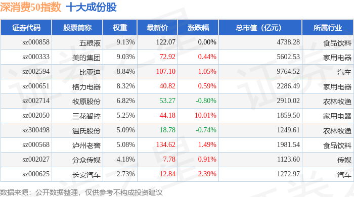 证券之星消息,10月15日,深消费50(399646)指数报收于8249.09点,涨1.14%,成交539.93亿元,换手率1.81%。当日该指数成份股中,上涨的有39家,三花智控以10.01%的涨幅领涨,下跌的有10家,华利集团以1.47%的跌幅领跌。