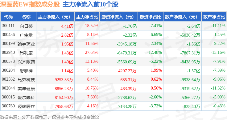 资金流向方面,深医药EW(399676)指数成份股当日主力资金净流入合计27.33亿元,游资资金净流出合计11.97亿元,散户资金净流出合计15.36亿元。成份股资金流向详情见下表: