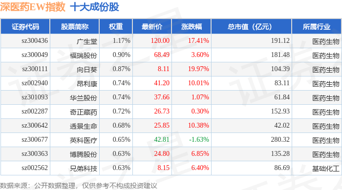 证券之星消息,10月15日,深医药EW(399676)指数报收于3839.95点,涨2.66%,成交562.51亿元,换手率2.44%。当日该指数成份股中,上涨的有207家,向日葵以19.97%的涨幅领涨,下跌的有10家,大博医疗以2.94%的跌幅领跌。