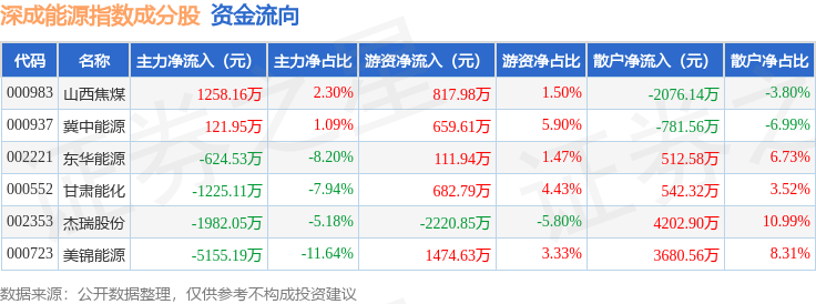 资金流向方面,深成能源(399680)指数成份股当日主力资金净流出合计7606.78万元,游资资金净流入合计1526.11万元,散户资金净流入合计6080.67万元。成份股资金流向详情见下表: