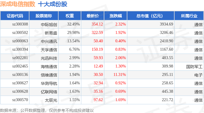 证券之星消息,10月15日,深成电信(399688)指数报收于5019.23点,涨1.86%,成交476.41亿元,换手率4.19%。当日该指数成份股中,上涨的有14家,信维通信以11.31%的涨幅领涨,下跌的有1家,中瓷电子以0.47%的跌幅领跌。