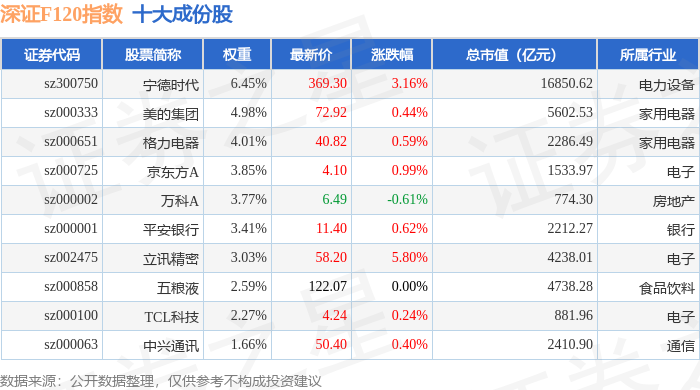 证券之星消息,10月15日,深证F120(399702)指数报收于7648.78点,涨1.14%,成交2059.9亿元,换手率1.51%。当日该指数成份股中,上涨的有93家,三花智控以10.01%的涨幅领涨,下跌的有20家,赣锋锂业以3.42%的跌幅领跌。