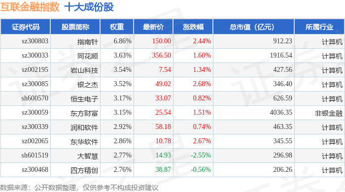互联金融(399805)指数十大成份股详情如下: