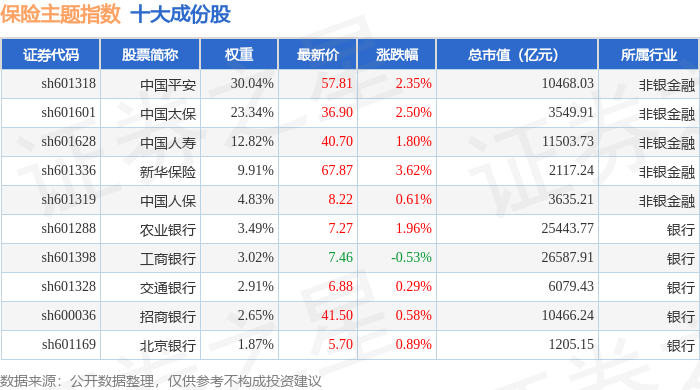 证券之星消息,10月15日,保险主题(399809)指数报收于2395.94点,涨2.01%,成交338.34亿元,换手率0.29%。当日该指数成份股中,上涨的有13家,新华保险以3.62%的涨幅领涨,下跌的有3家,中油资本以2.2%的跌幅领跌。