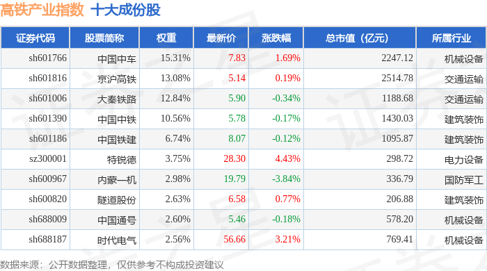证券之星消息,10月15日,高铁产业(399807)指数报收于1343.25点,涨0.75%,成交132.44亿元,换手率0.84%。当日该指数成份股中,上涨的有36家,国电南自以9.98%的涨幅领涨,下跌的有8家,内蒙一机以3.84%的跌幅领跌。