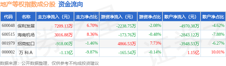 资金流向方面,地产等权(399983)指数成份股当日主力资金净流出合计1991.37万元,游资资金净流入合计2288.48万元,散户资金净流出合计297.11万元。成份股资金流向详情见下表: