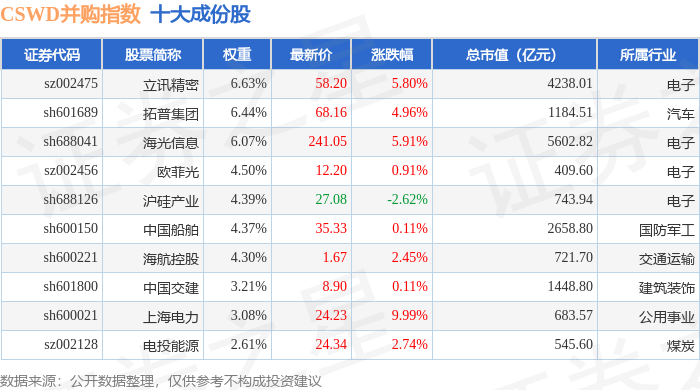 CSWD并购(399992)指数十大成份股详情如下: