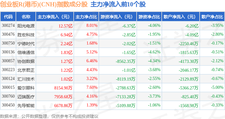 资金流向方面,创业板R(港币)(CNH)(470006)指数成份股当日主力资金净流出合计2.21亿元,游资资金净流出合计16.18亿元,散户资金净流入合计18.4亿元。成份股资金流向详情见下表: