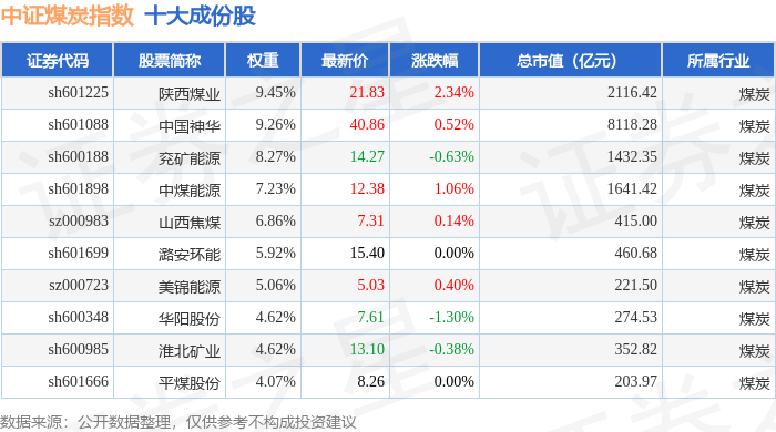 中证煤炭(399998)指数十大成份股详情如下: