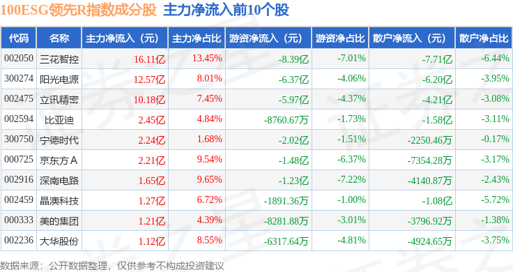 资金流向方面,100ESG领先R(470030)指数成份股当日主力资金净流入合计32.04亿元,游资资金净流出合计26.56亿元,散户资金净流出合计5.49亿元。成份股资金流向详情见下表: