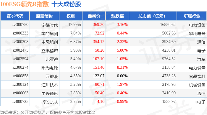 证券之星消息,10月15日,100ESG领先R(470030)指数报收于9016.24点,涨2.0%,成交1575.84亿元,换手率1.68%。当日该指数成份股中,上涨的有36家,三花智控以10.01%的涨幅领涨,下跌的有13家,赣锋锂业以3.42%的跌幅领跌。