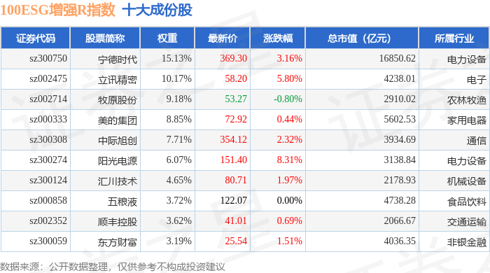 证券之星消息,10月15日,100ESG增强R(470033)指数报收于1696.7点,涨2.25%,成交1274.2亿元,换手率1.55%。当日该指数成份股中,上涨的有30家,三花智控以10.01%的涨幅领涨,下跌的有9家,招商港口以1.54%的跌幅领跌。