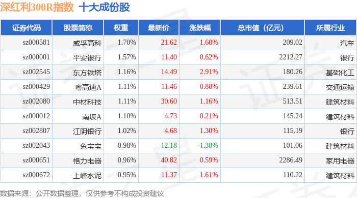 证券之星消息,10月15日,深红利300R(470062)指数报收于8115.02点,涨1.45%,成交2107.17亿元,换手率2.08%。当日该指数成份股中,上涨的有251家,良信股份以10.04%的涨幅领涨,下跌的有42家,中绿电以3.95%的跌幅领跌。