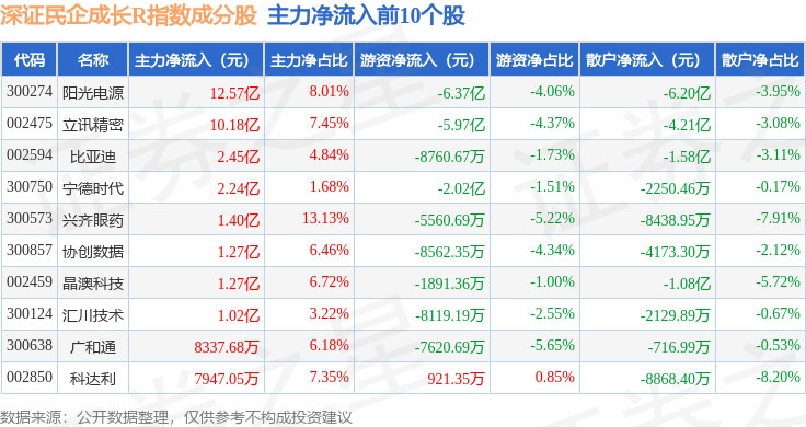 资金流向方面,深证民企成长R(470071)指数成份股当日主力资金净流入合计5.39亿元,游资资金净流出合计17.52亿元,散户资金净流入合计12.13亿元。成份股资金流向详情见下表: