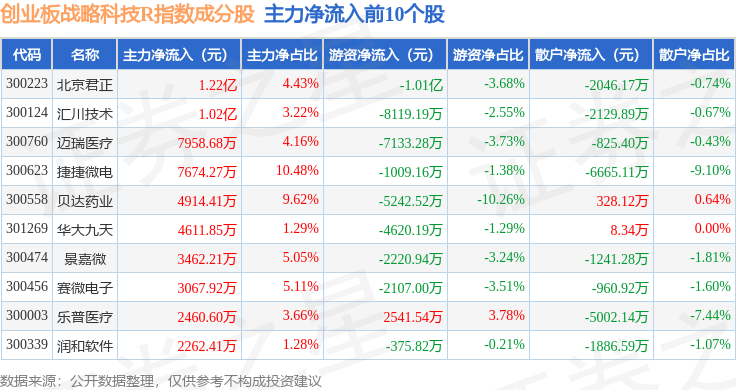 资金流向方面,创业板战略科技R(471004)指数成份股当日主力资金净流出合计5.13亿元,游资资金净流出合计4.17亿元,散户资金净流入合计9.29亿元。成份股资金流向详情见下表: