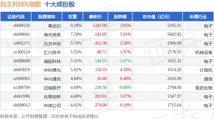 自主科技R(480033)指数十大成份股详情如下: