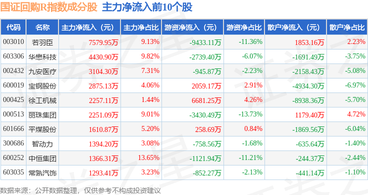 资金流向方面,国证回购R(480063)指数成份股当日主力资金净流入合计8318.35万元,游资资金净流出合计1.01亿元,散户资金净流入合计1768.21万元。成份股资金流向详情见下表: