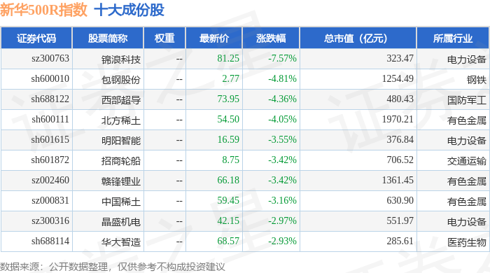 新华500R(489001)指数十大成份股详情如下: