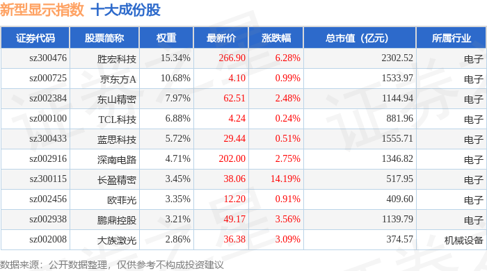 新型显示(970048)指数十大成份股详情如下: